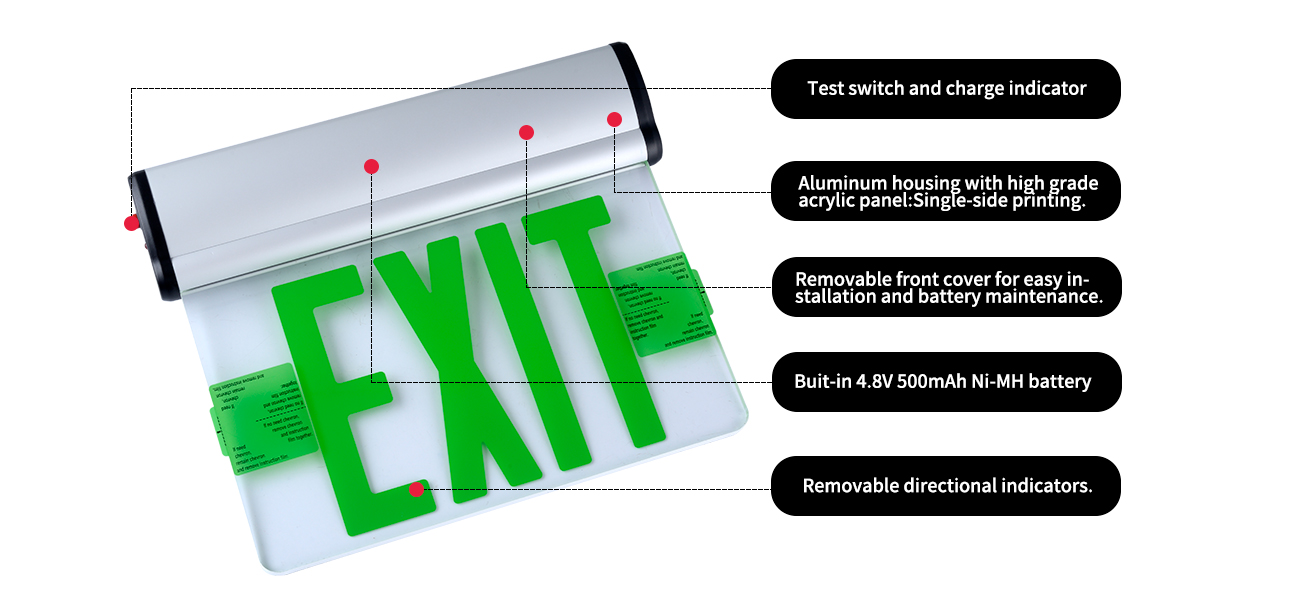 *Pag -iilaw - Ang gilid na ito ay naglabas ng serye ng pag -sign ng exit ay nagbibigay ng isang mahabang buhay na pag -iilaw ng LED. Ang yunit ay itinayo gamit ang isang berdeng mataas na output LED board.  Ang pagkonsumo ng enerhiya ay minarkahan ng mas mababa sa 3 watts para sa mga yunit ng modelo lamang ng AC. Ang mga yunit ng pag -backup ng baterya ay na -rate ng mas mababa sa 1 watts.
