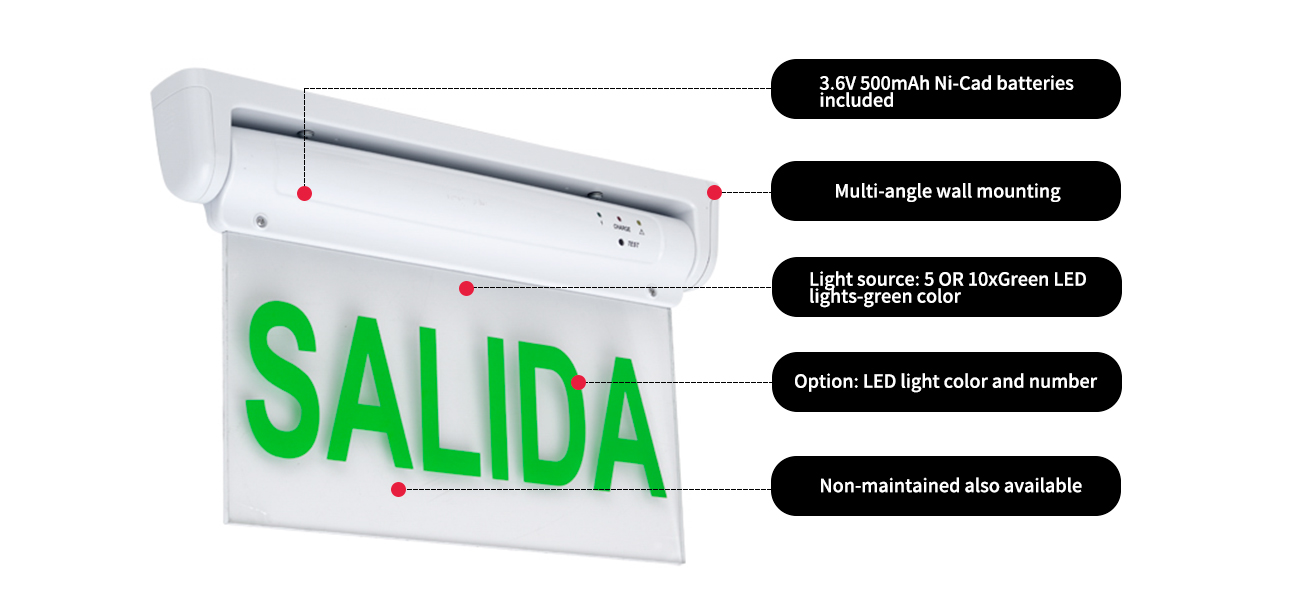 *Pag-backup ng Baterya ng Emergency Power- Ang LED exit sign ay dinisenyo gamit ang isang maintenance-free 3.6V 500mAh Ni-CAD na baterya na nagbibigay ng isang minimum na tagal ng emergency na 6 na oras. Ang oras ng pag -recharge ng baterya ay 24 na oras.